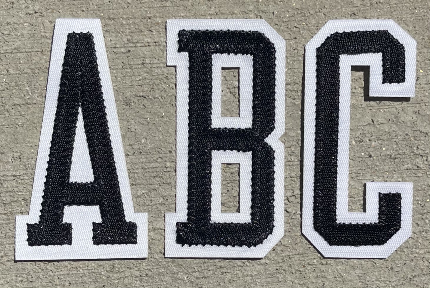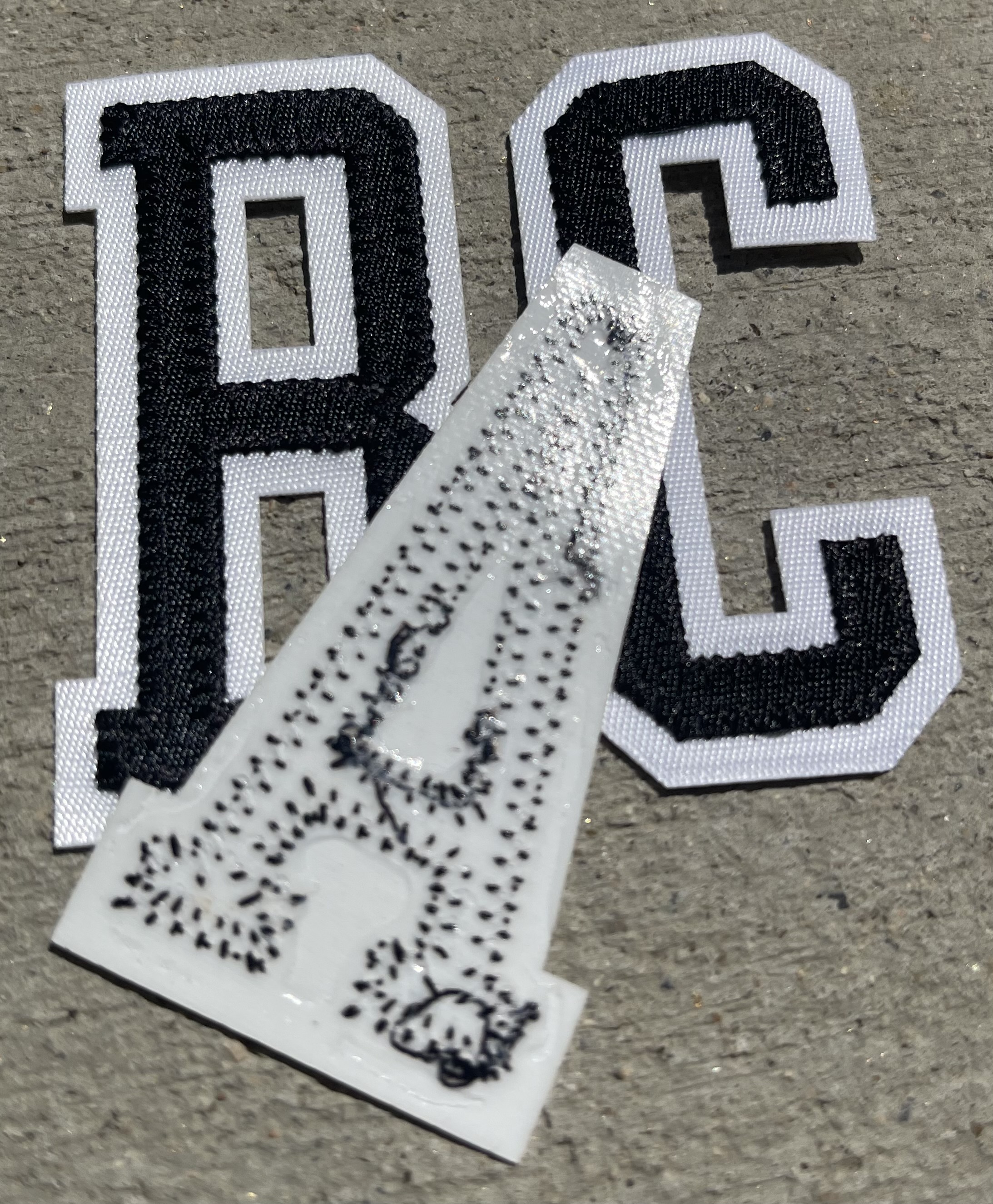 Player name letter styles in Chicago Bulls style, thin black on white tackle twill with heat transfer material on reverse.
