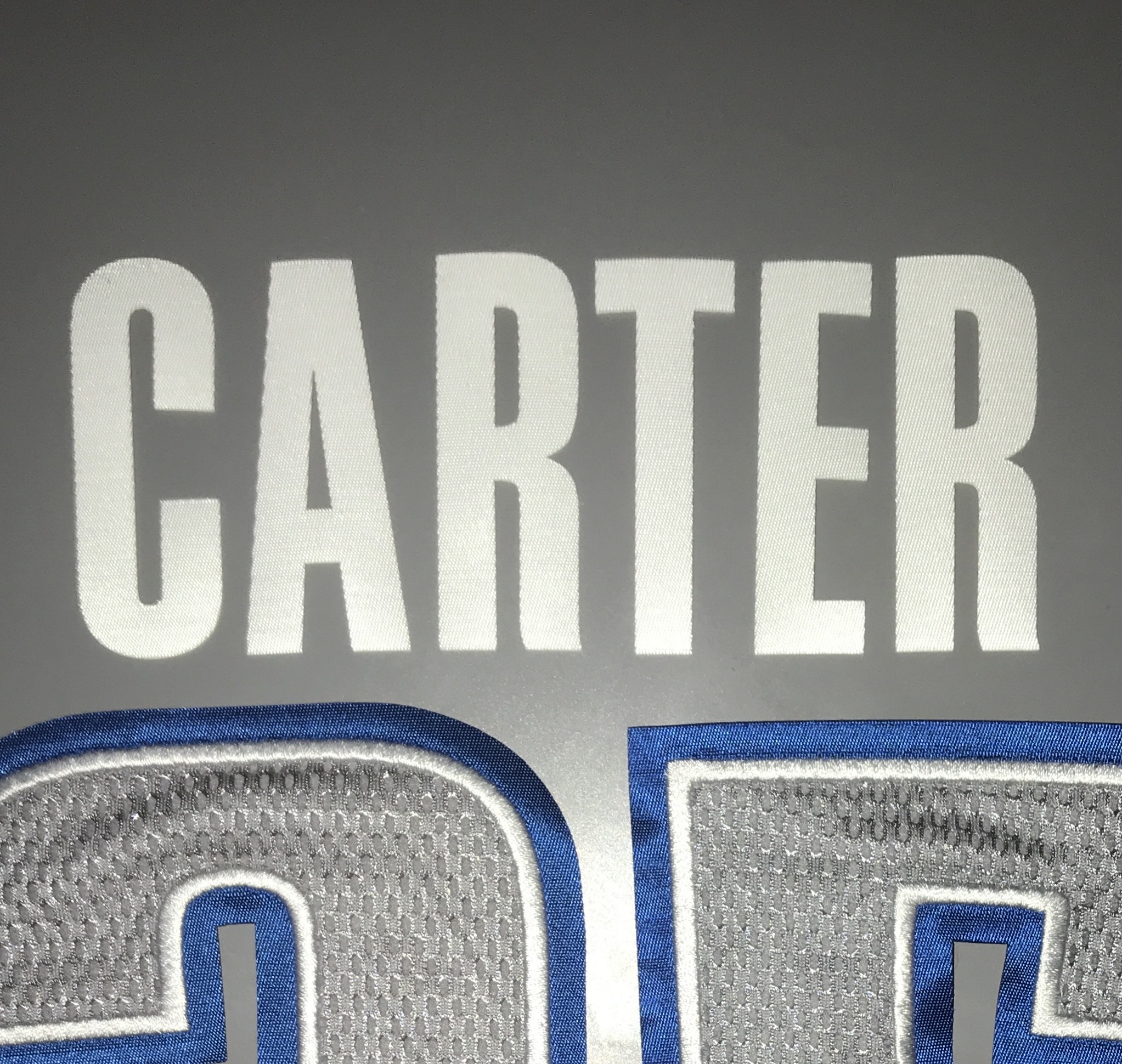One of the most commonly used player name letter styles on road jerseys, all-white twill front with heat transfer material on reverse. Teams that utilized this letter font include: Brooklyn Nets, Detroit Pistons, Indiana Pacers, Atlanta Hawks, Orlando Magic, Washington Wizards, Minnesota Timberwolves, OKC Thunder, Portland Trail Blazers, LA Clippers, Sacramento Kings, Dallas Mavericks, Houston Rockets, and Memphis Grizzlies